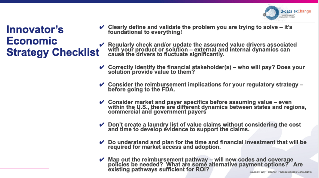 | Clinical | Impact on patient health and disease management; safety and effectiveness | Health outcomes (e.g., lower A1C), prevention of complications, decreased mortality |